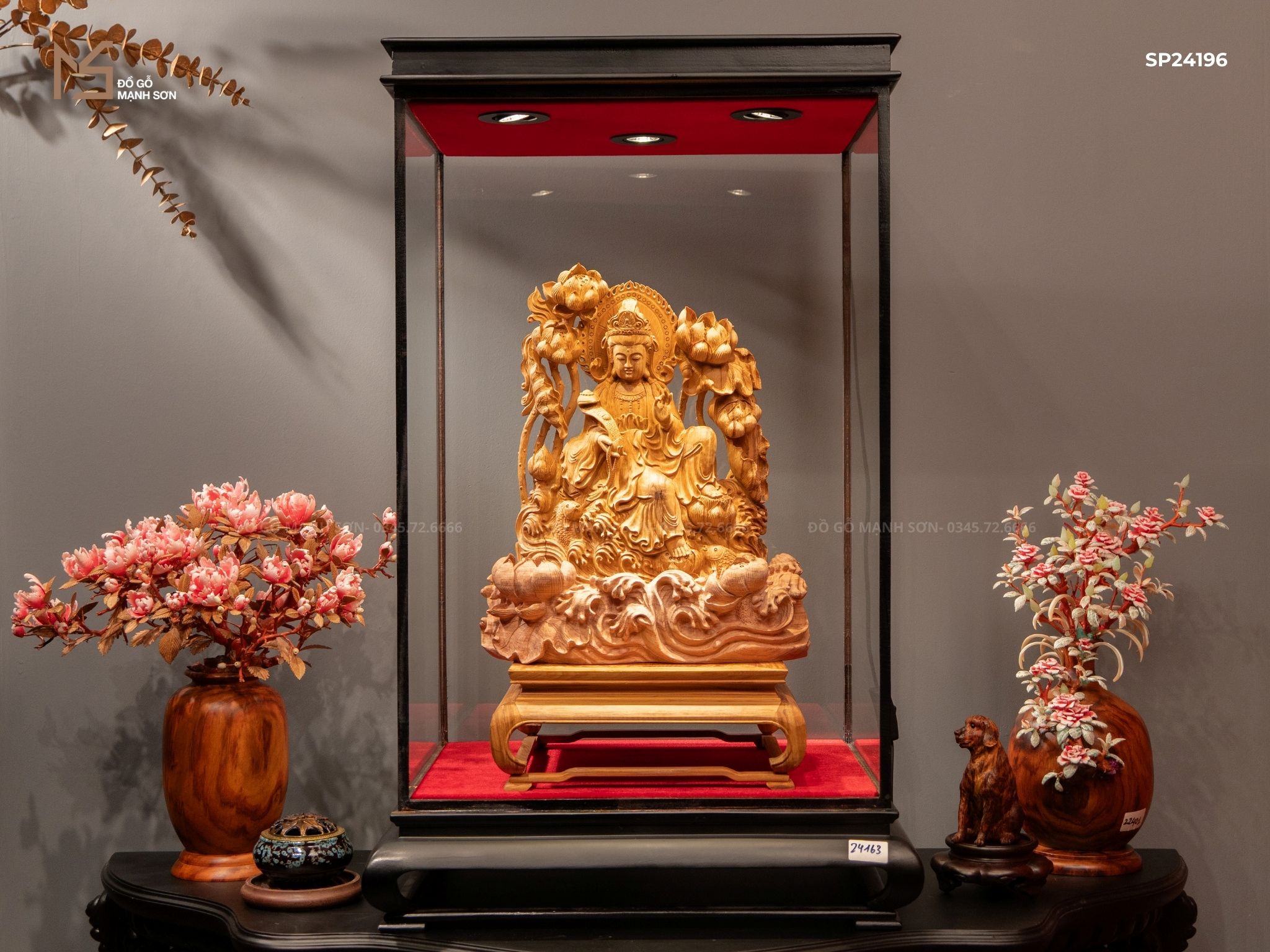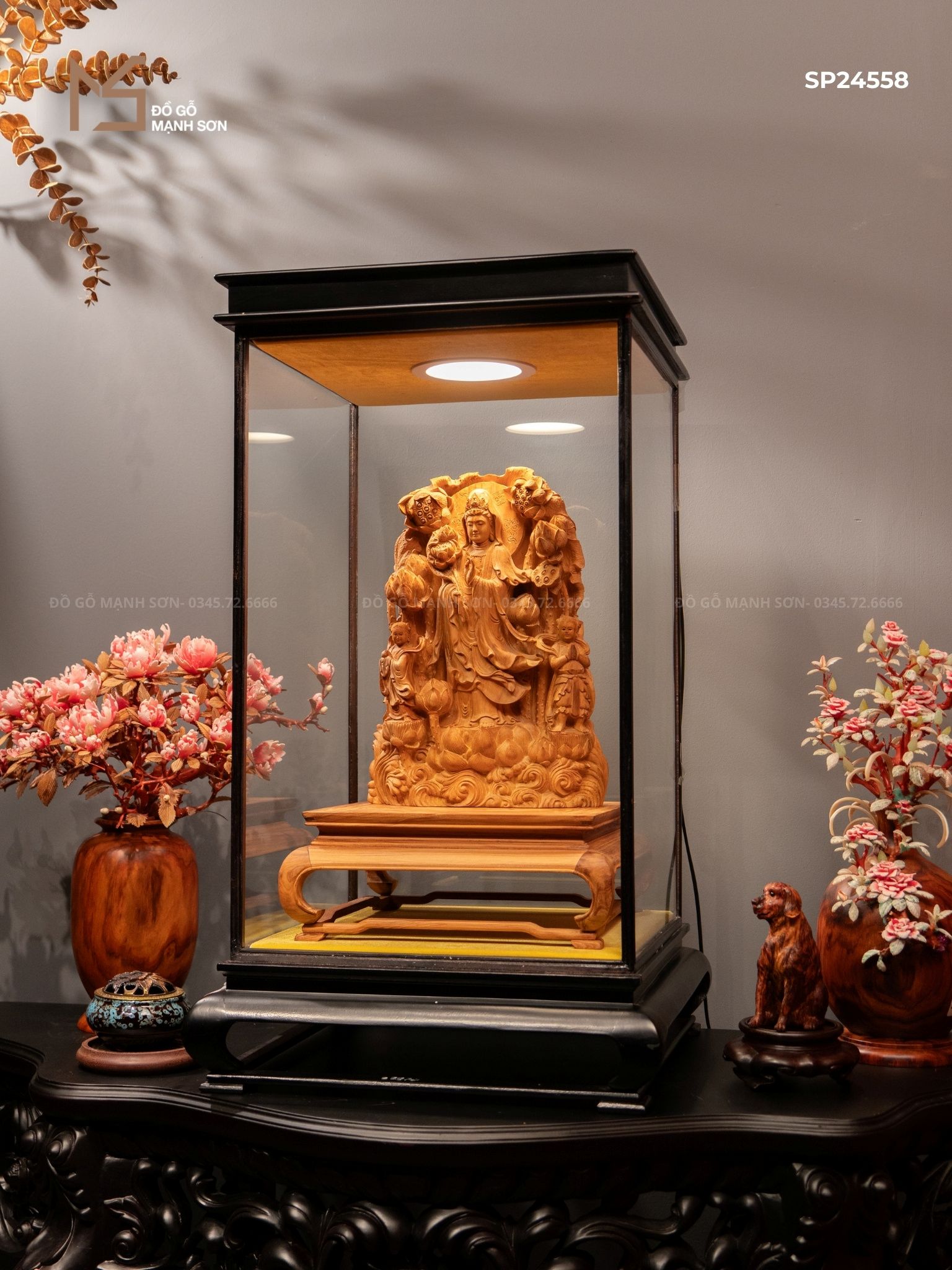 Hình ảnh Phật Quan Âm đứng trên tòa sen, tay cầm bình cam lộ vốn vô cùng quen thuộc với mỗi người. Bởi vậy mà các nghệ nhân của Đồ Gỗ Mạnh Sơn đã tái hiện trọn vẹn hình ảnh đó trên tác phẩm tượng gỗ.