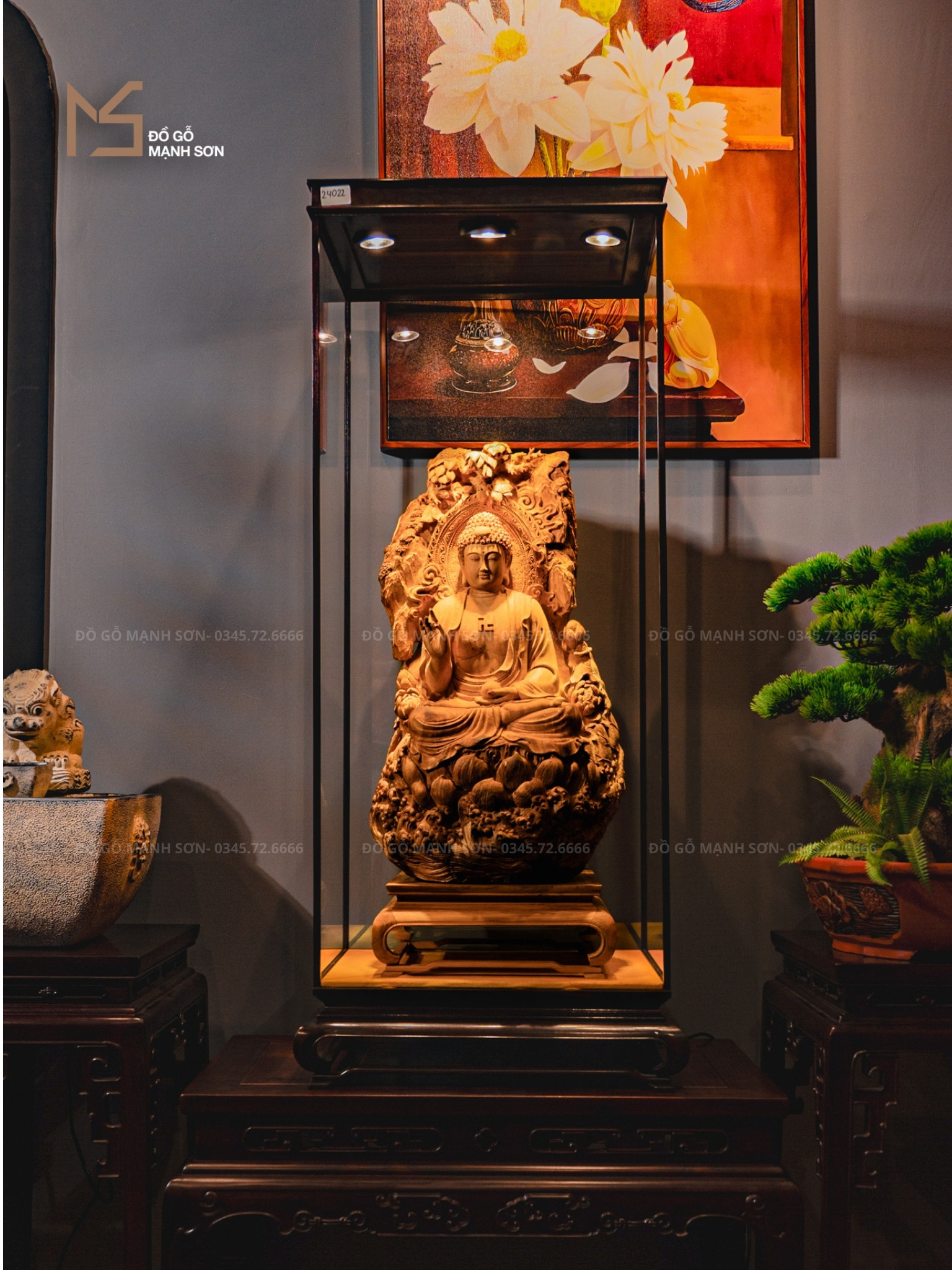 Tôn tượng Phật A Di Đà này của Đồ Gỗ Mạnh Sơn được chế tác đầy tinh xảo. Hình ảnh ngài ngồi trên tòa sen, phía bên trên có hào quang tỏa rạng mang vẻ đẹp của sự bình yên, an lành.