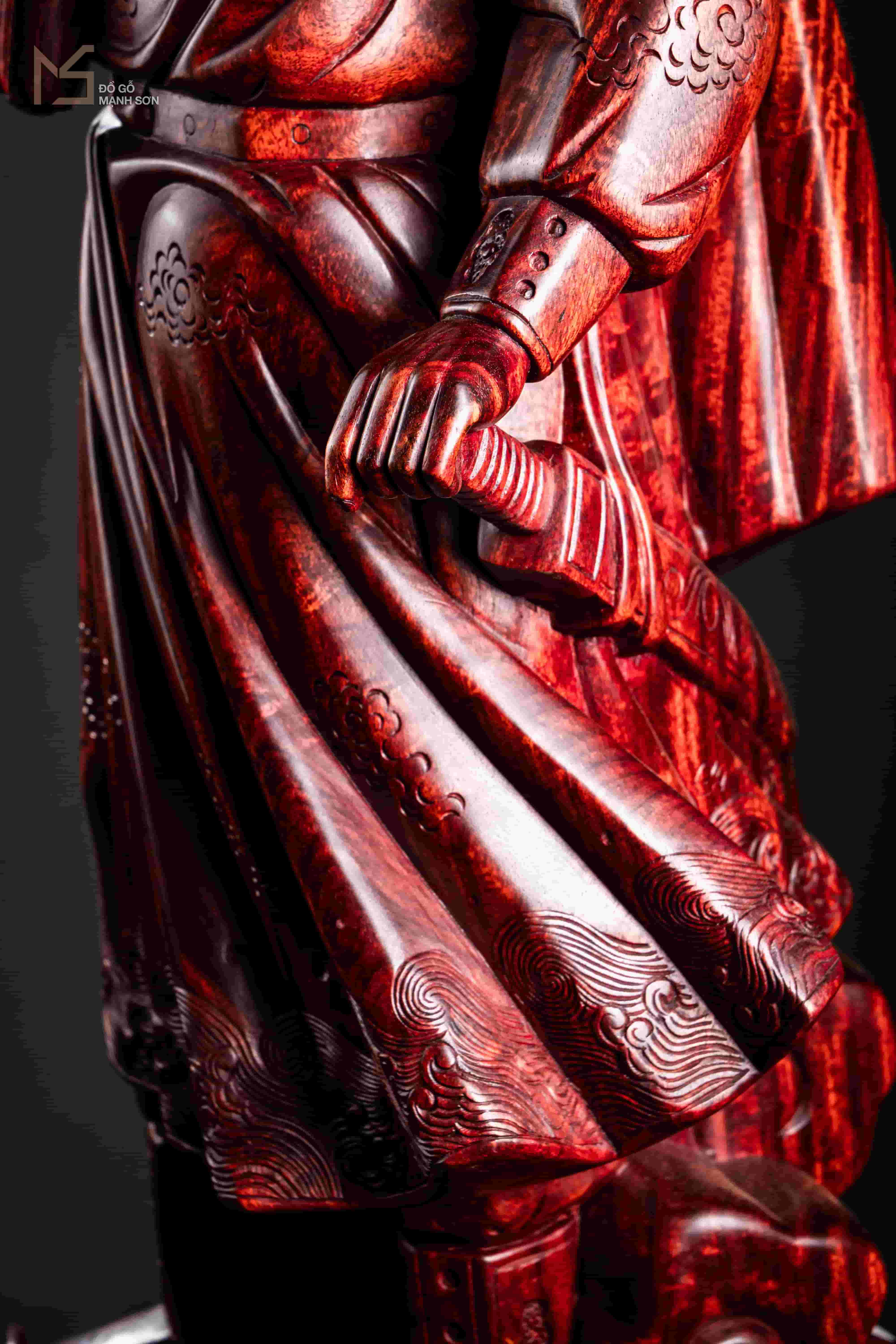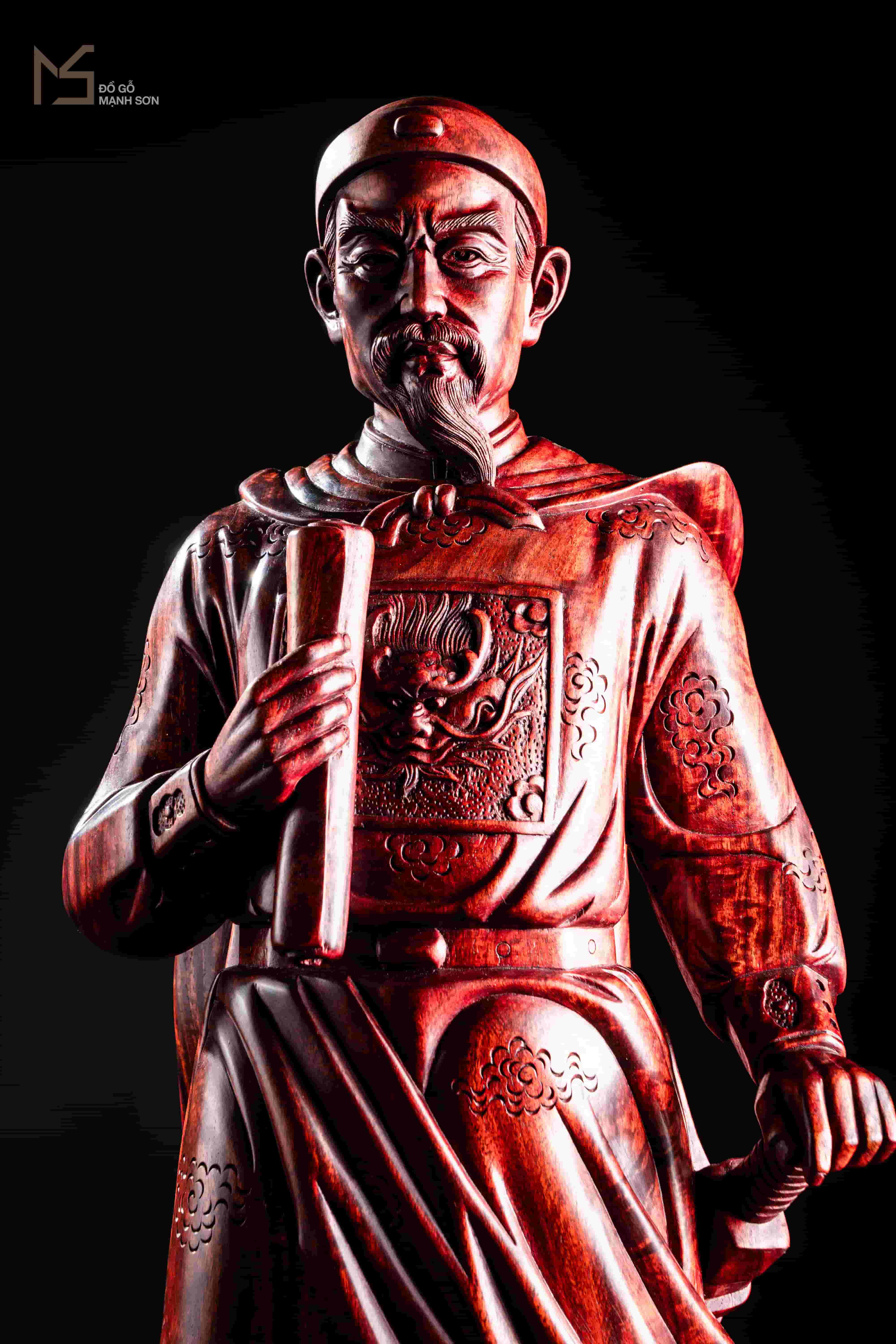 Bởi đó, tượng gỗ Trần Hưng Đạo được khắc họa nổi bật với khuôn mặt uy nghiêm, tay phải cầm chiếu thư, tay trái cầm kiếm, cả người toát ra khí chất của một vị thánh, thể hiện được sức mạnh và ý chí quyết tâm chống lại giặc xâm lăng. Chính vì thế, tượng Trần Hưng Đạo là một trong những tác phẩm tượng gỗ mang lại hiệu quả trấn trạch rất cao, loại trừ ma tà xâm nhập, quấy nhiễu, mang tới sự bình an và yên ổn cho gia chủ và các thành viên trong gia đình.