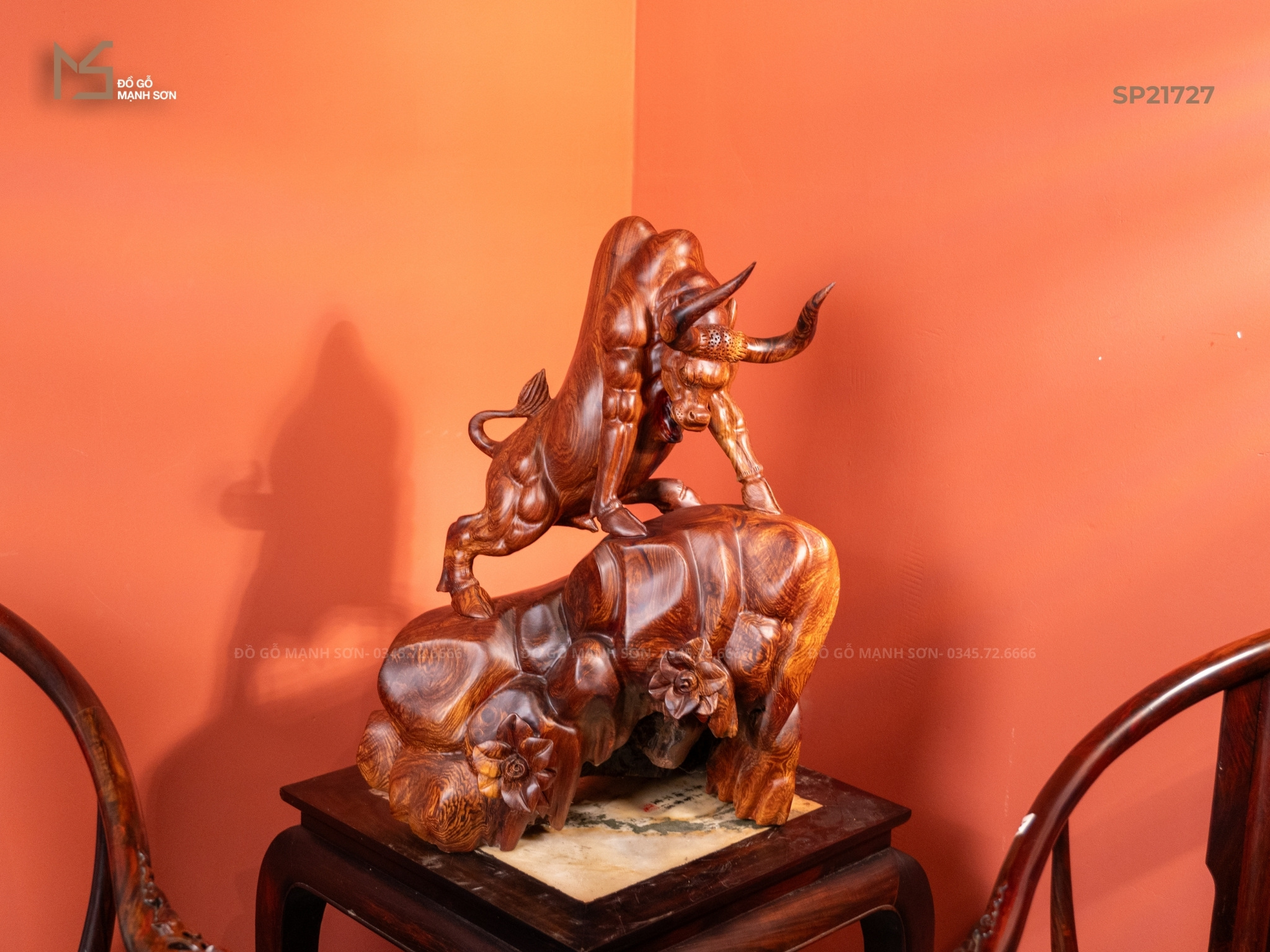 Chú bò tót được khắc họa trên dòng gỗ cẩm là sự lựa chọn dành cho gia chủ mạnh mẽ, quyết đoán, luôn sẵn sàng đối diện thử thách và không ngại va chạm để tiến lên.